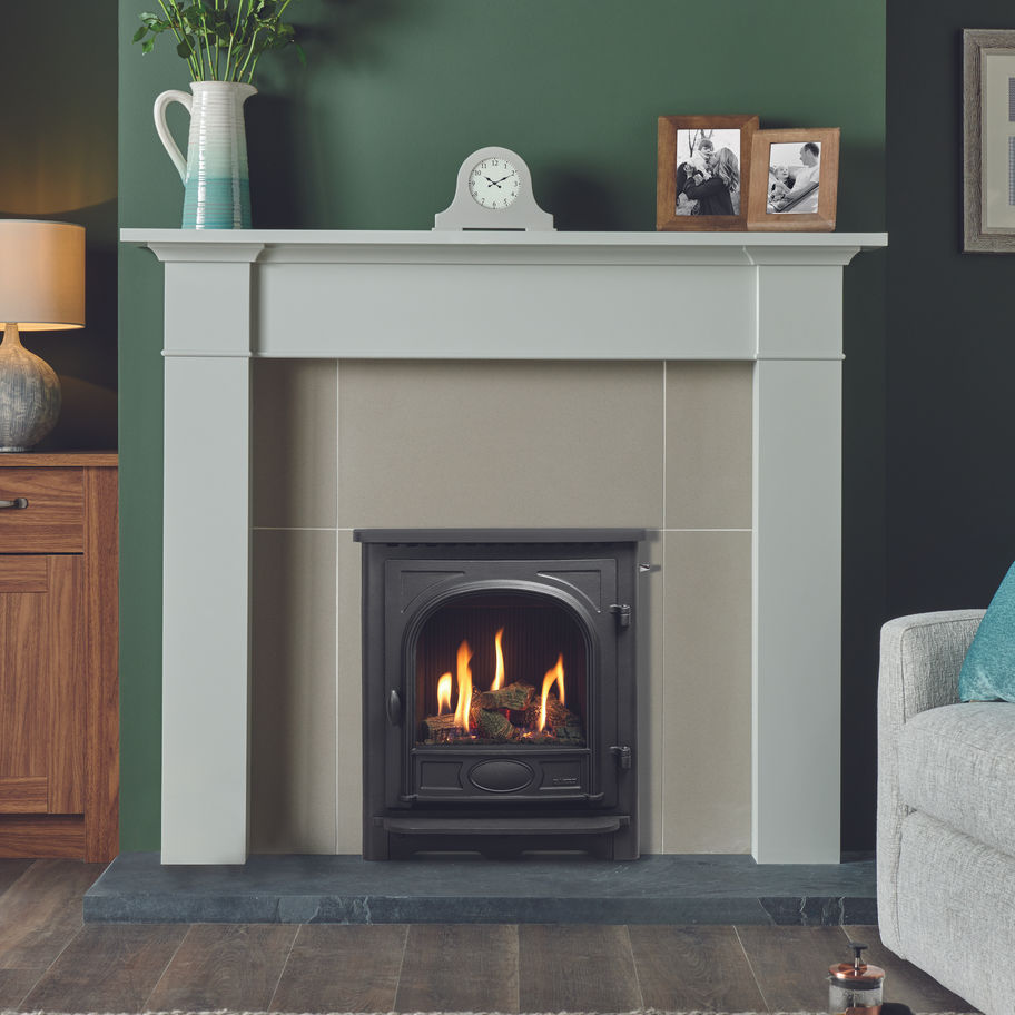 The Stockton glass-fronted inset gas fire combines the looks of a traditional cast stove with the latest high-efficiency heating. The fuel bed is coal effect on conventionally flued models and log effect when installed with a balanced flue.