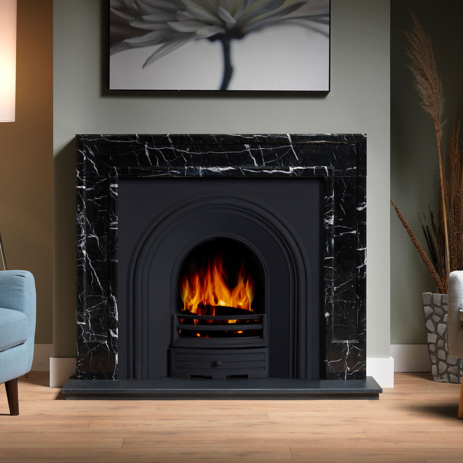 Pictured here in Nero Marble with the Falkirk cast insert in black and honed granite hearth.